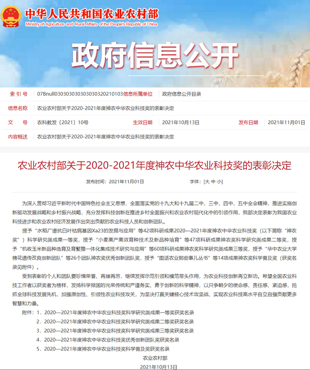 11月1日,农业农村部官网发布了《关于2020-2021年度神农中华农业科技奖的表彰决定》(农科教发〔2021〕10号),对在2020-2021年度为我国农业科技进步和农业农村经济发展作出突出贡献的农业科技人员和创新团队进行表彰。由江苏省农垦农业发展股份有限公司主持,联合江苏省农业技术推广总站、扬州大学共同完成的“稻麦两熟亩产1200公斤绿色高效关键技术创新与应用”项目获得科学研究类成果三等奖。