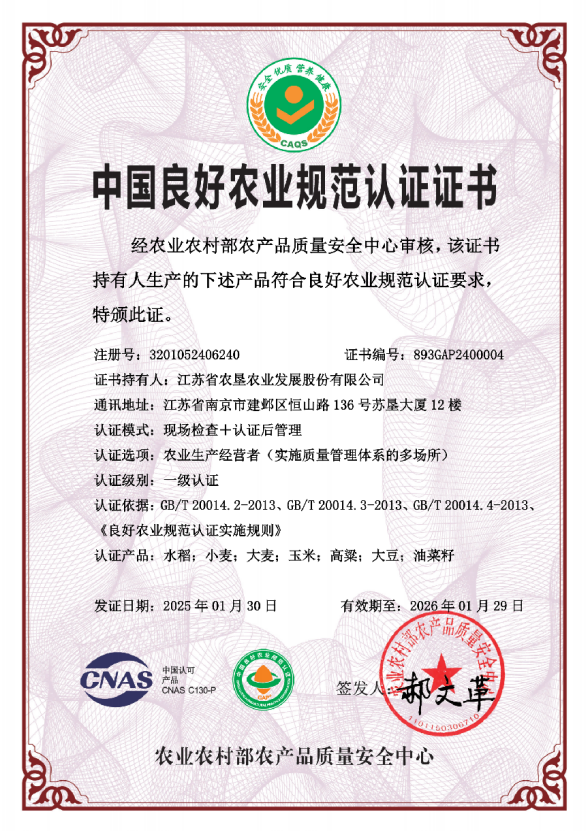 2024年,苏垦农发为强化农产品生产全过程的质量与安全管理,提高种植基地农业生产标准化、规范化和可持续发展水平,认证并通过了20家种植基地水稻、小麦、大麦、玉米、大豆、油菜、高粱等7种作物的全国良好农业规范(GAP)一级认证,率先通过农业农村部农产品质量安全中心良好农业规范(GAP)质量管理体系的多场所认证,是全国单体规模最大的一级认证单位。一年来,公司依托全产业链纵向一体化管理优势,对种植基地生产环境质量、投入品使用、农产品质量控制等方面进行严格规范化管理,全面提升农业生产标准化、规范化管理水平,为公司农业生产可持续发展提供了保障。