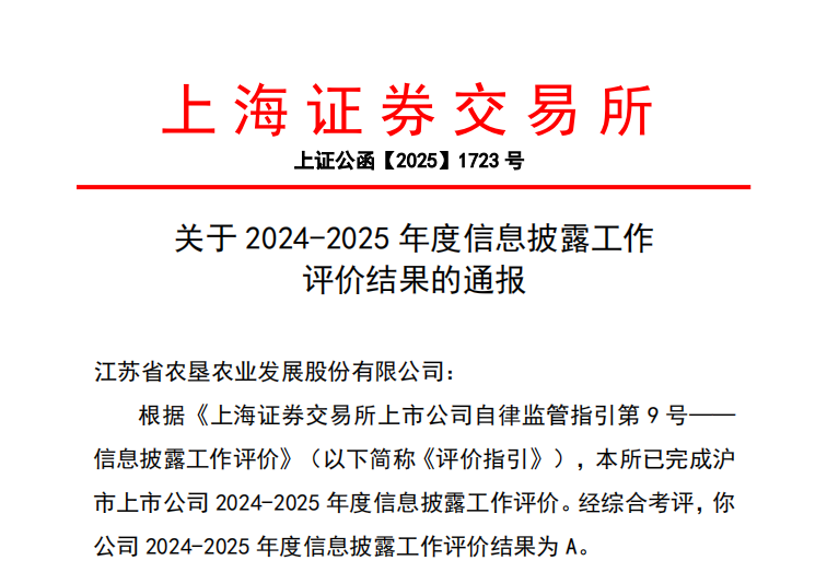 •        近日,上海证券交易所公布沪市主板上市公司2024-2025年度信息披露工作评价结果,苏垦农发(股票代码:601952)再次获评最高等级“A”级。至此,公司已连续六年蝉联上交所信息披露最高评级。